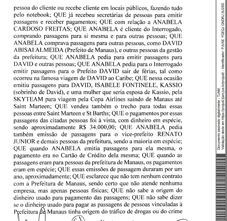 A agência Revoar Turismo, do empresário Alcir Queiroga — investigado na operação Erga Omnes por suspeita de lavar dinheiro para um grupo criminoso — teria emitido cerca de R$ 34 mil em passagens para o Caribe, pagas em dinheiro vivo, para o prefeito de Manaus, David Almeida, a primeira-dama Izabelle Fontenelle, um sobrinho do prefeito e a esposa dele.
